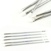 Soft white synthetic brushes manufactured using specially selected and blended length and thickness filaments to hold sharp edges in flats and fine needle points in rounds. The spring and color carrying capacity duplicates the finest natural hair, at a fraction of the price. These multi-purpose brushes are suitable for use with acrylics, watercolor, gouache, water mixable oils and all water base media. Silverwhite is fitted with long polished, white tipped silver handles and seamless nickel ferrules. They offer extraordinary value for easel painters working in acrylics and all water media.- Angular Brights/Shaders: Used for tight shading and curved strokes.